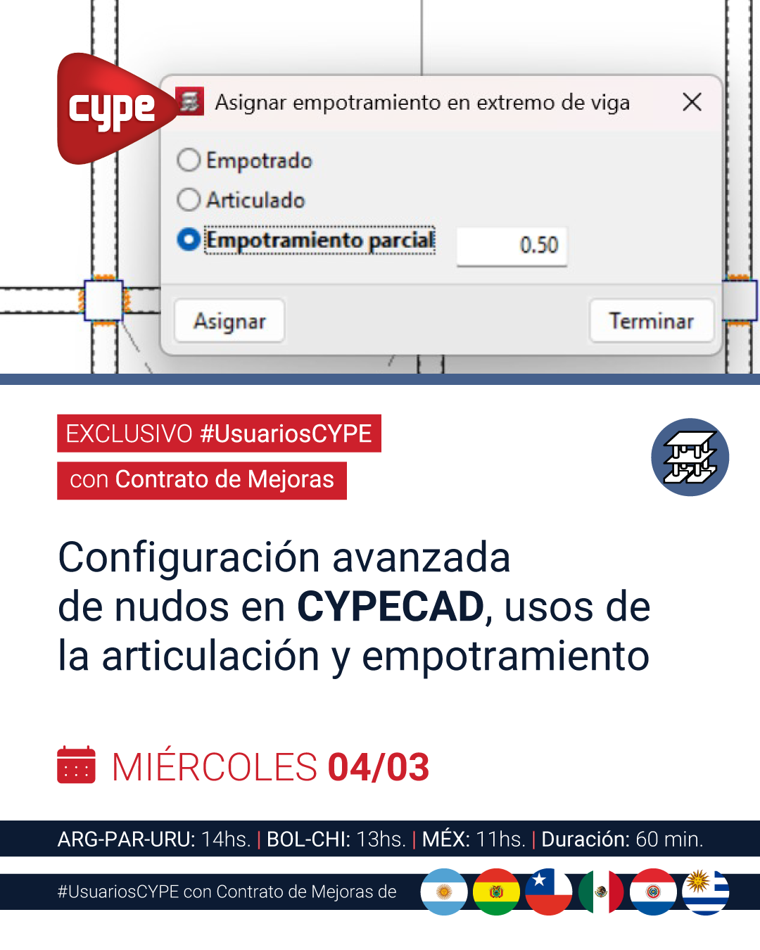 JORNADA EXCLUSIVA USUARIOS CON CONTRATO DE MEJORAS: Configuración avanzada de nudos en CYPECAD, usos de la articulación y empotramiento.